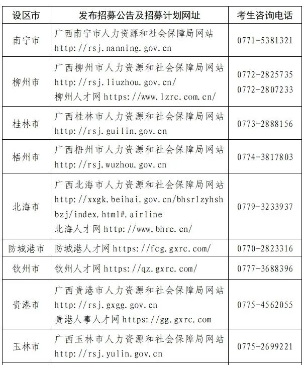 具體事宜可進(jìn)入廣西“三支一扶”網(wǎng)(http://szyf.gxrc.com)查詢(xún)政策或向各市“三支一扶”辦公室電話咨詢(xún)。