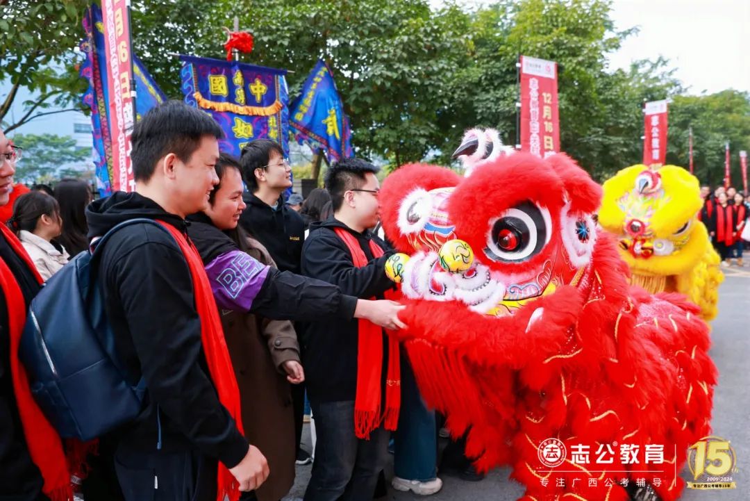 志公教育還專門請來了舞獅隊,舞獅點睛是重頭戲,董事長李勇帶領(lǐng)著公司領(lǐng)導(dǎo)們手持毛筆蘸取朱砂,對獅頭天庭進行點睛。