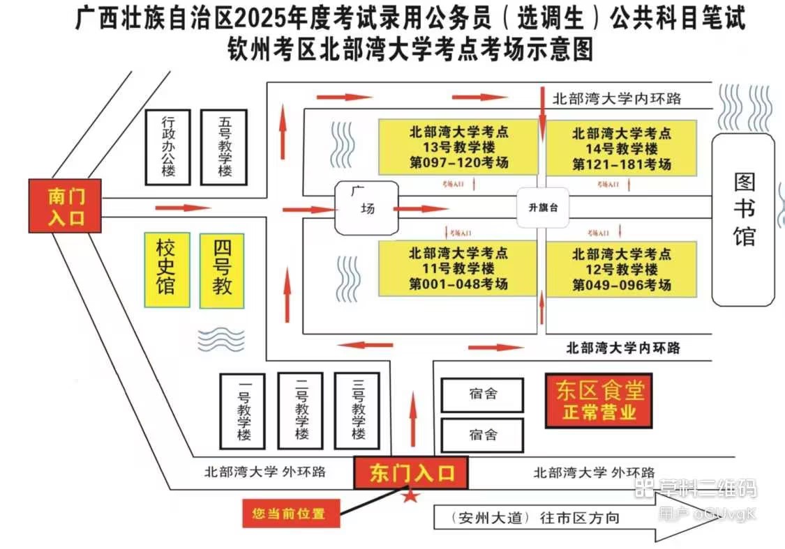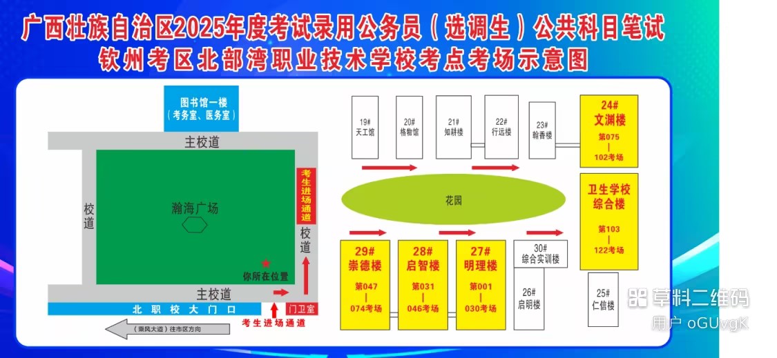 欽州考區(qū)共設(shè)兩個考點,分別為北部灣大學(xué)考點、北部灣職業(yè)技術(shù)學(xué)校考點。(考點地址和具體考場安排請掃附后的二維碼查看)