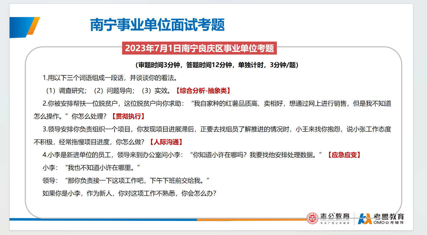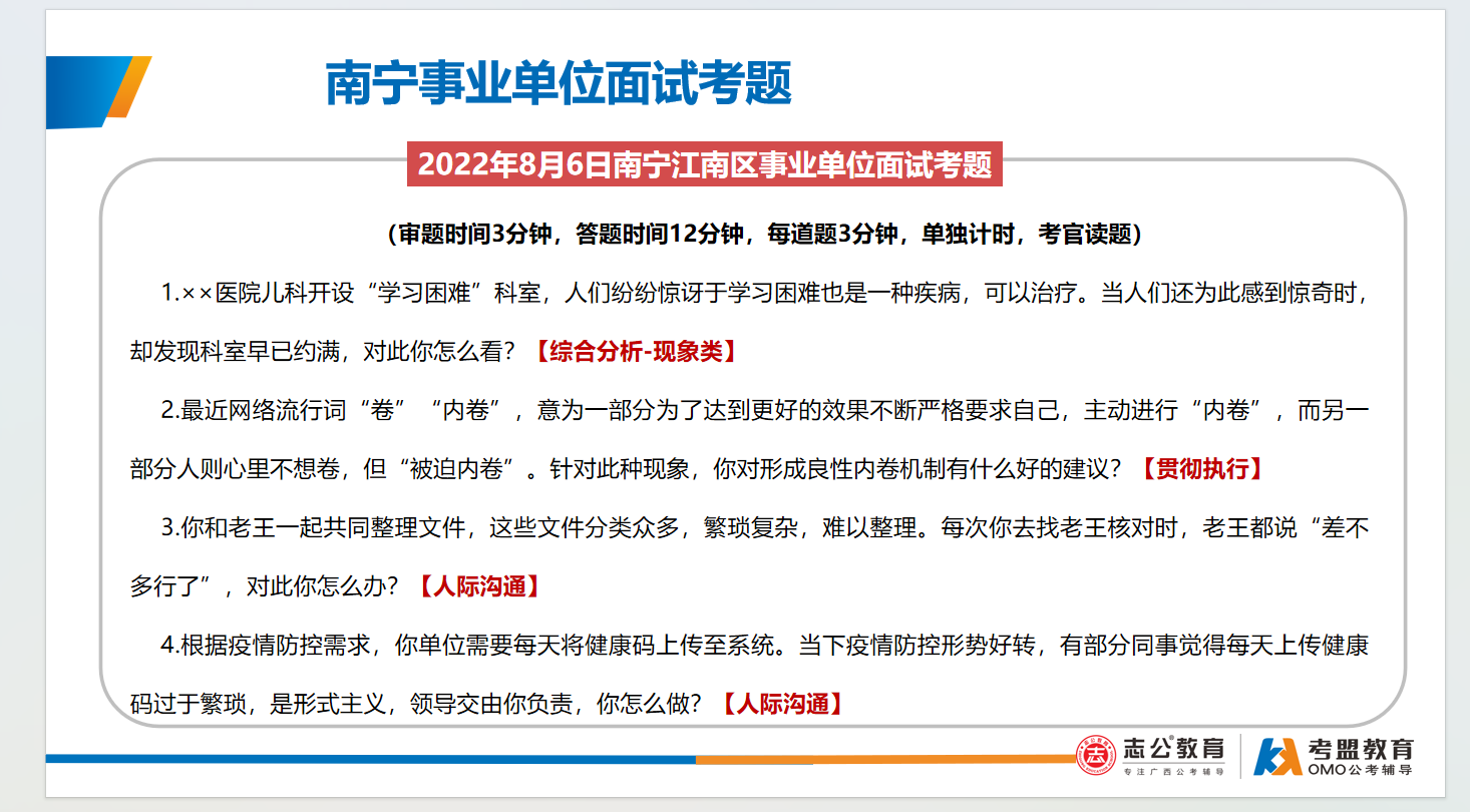 南寧事業(yè)單位面試主要采用結(jié)構(gòu)化面試形式、考查題量有3-4題,答題時間為9-12分鐘,考查題型:綜合分析(極高)、計(jì)劃組織(極高)、人際溝通(極高)、應(yīng)急應(yīng)變(一般)、貫徹執(zhí)行(一般)、自我認(rèn)知(一般):