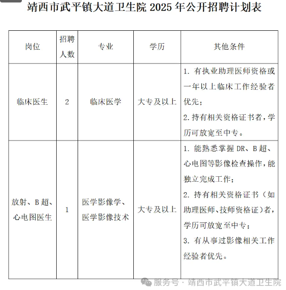 原文標題:靖西市武平鎮(zhèn)大道衛(wèi)生院2025年公開招聘臨床醫(yī)生、影像專業(yè)技術人員公告!