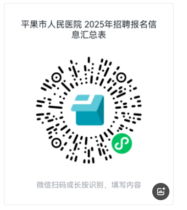 1.填寫提交紙質(zhì)版《平果市人民醫(yī)院2025年度公開招聘專業(yè)技術(shù)人員報(bào)名表》(附件3),并掃描下方二維碼填寫報(bào)名信息。