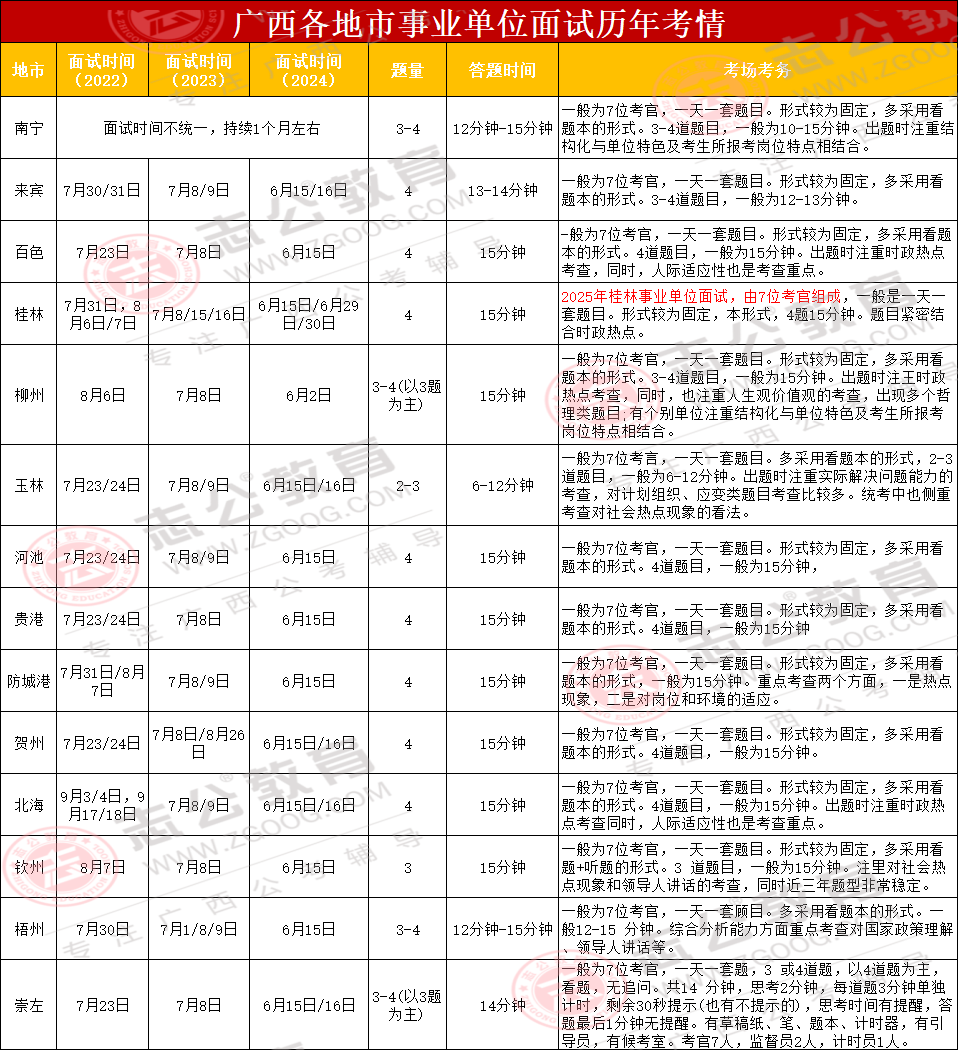 當然,我們還可以根據(jù)歷年廣西事業(yè)單位面試時間參考,推測全部地市是不是集中面試,小志給大家整理了歷年廣西各地事業(yè)單位面試時間、題量、答題時間、考場考務,大家可以從下圖看出。