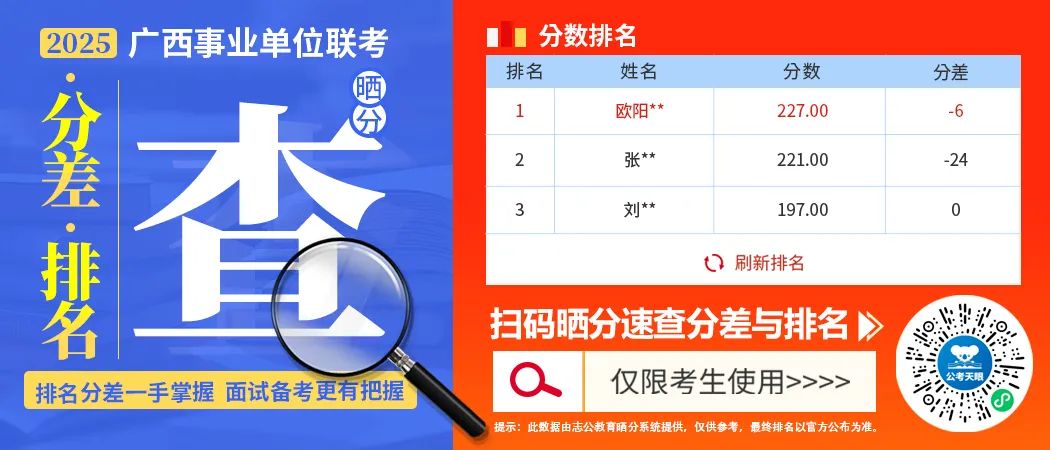 還是想要自己崗位對手與自己的筆試分差? 志公教育重磅推出 廣西事業(yè)單位排名、分差查詢系統(tǒng) 在線曬成績 知曉自己在崗位中的競爭力 方能針對性備考 曬出你的分數(shù)崗位排名丨與對手分差一目了然 剩余地市面試名單陸續(xù)發(fā)布 識別下方二維碼|速查排名、分差。