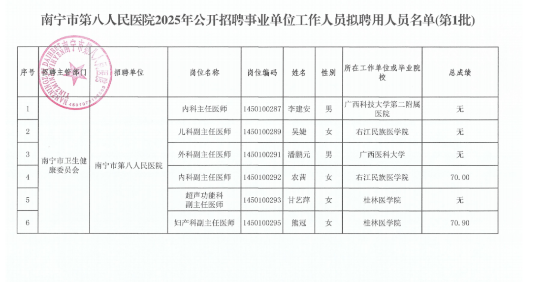 南寧市第八人民醫(yī)院2025年公開招聘事業(yè)單位工作人員擬聘用人員公示(第1批)