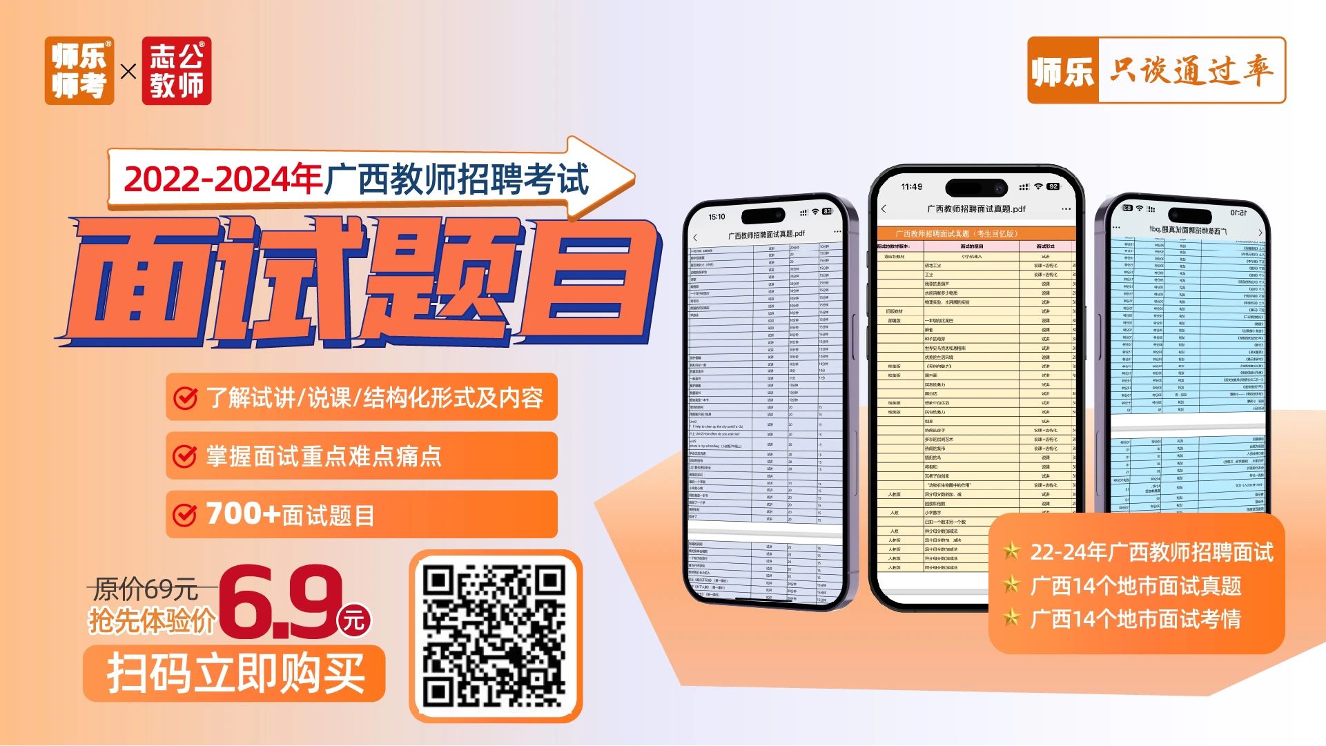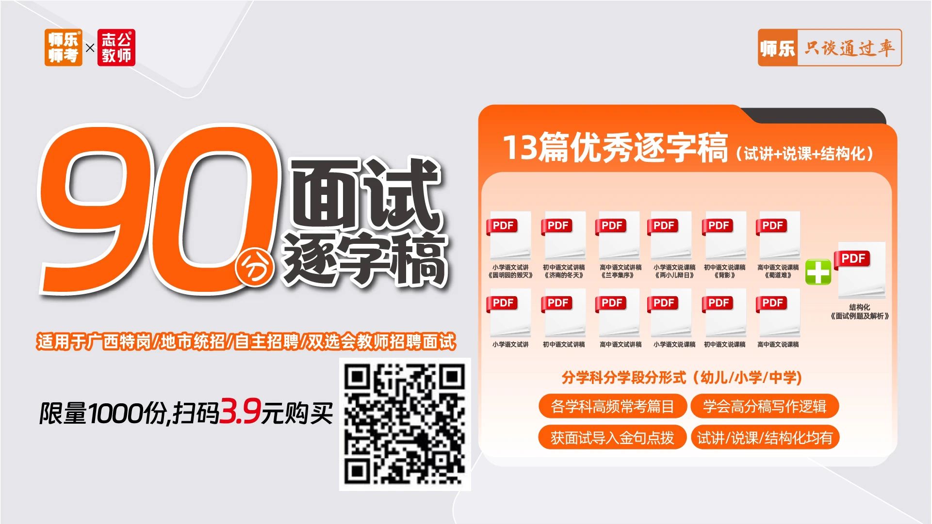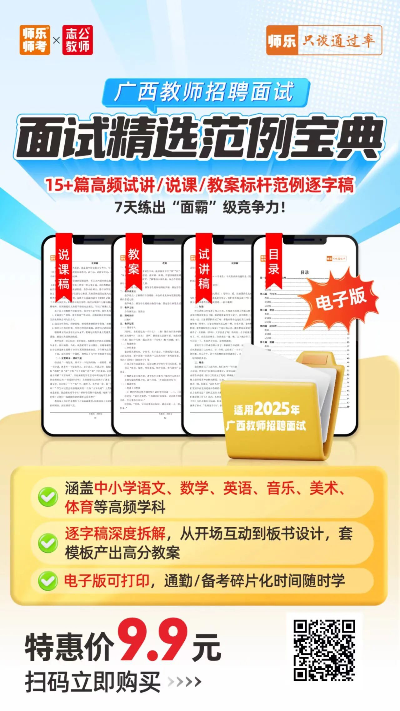 ??寫作邏輯+面試導(dǎo)入金句點(diǎn)撥 ?含13+篇試講+說課+結(jié)構(gòu)化 搶先體驗(yàn)價(jià):6.9元 ??14地市教招面試zhen題 了解試講/說課/結(jié)構(gòu)化形式及內(nèi)容 面試禮儀課 ??面試禮儀干貨介紹 正反面案例直觀對(duì)比 ??著裝、問候、儀態(tài)、言談禮儀等事項(xiàng)介紹 【師樂】廣西教招備考群 ??最新公告 備考資料 ??刷題打卡 考試交流