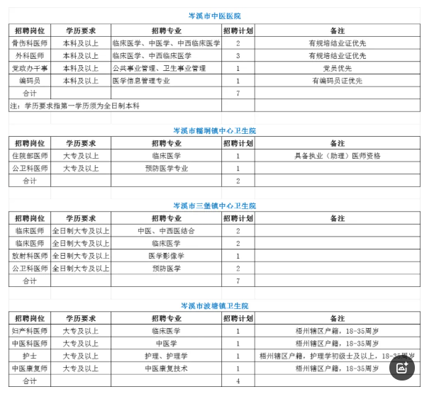岑溪市中醫(yī)醫(yī)院2025年6月計(jì)劃招聘人才7名,岑溪市中醫(yī)醫(yī)院醫(yī)共體成員單位共計(jì)招聘人才12名。