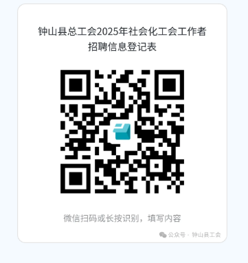 2.報名方式:采取網(wǎng)上報名方式報名。報名時間截止前,有意者請根據(jù)附件1填寫個人簡歷,并用微信掃描下方二維碼打開小程序填寫《鐘山縣總工會2025年社會化工會工作者招聘信息登記表》,上傳個人簡歷、身份證掃描件、學歷證書掃描件、學信網(wǎng)教育部學歷證書電子注冊備案表、榮譽證書掃描件、發(fā)表文章等佐證材料,逾期不再接收任何報送材料。