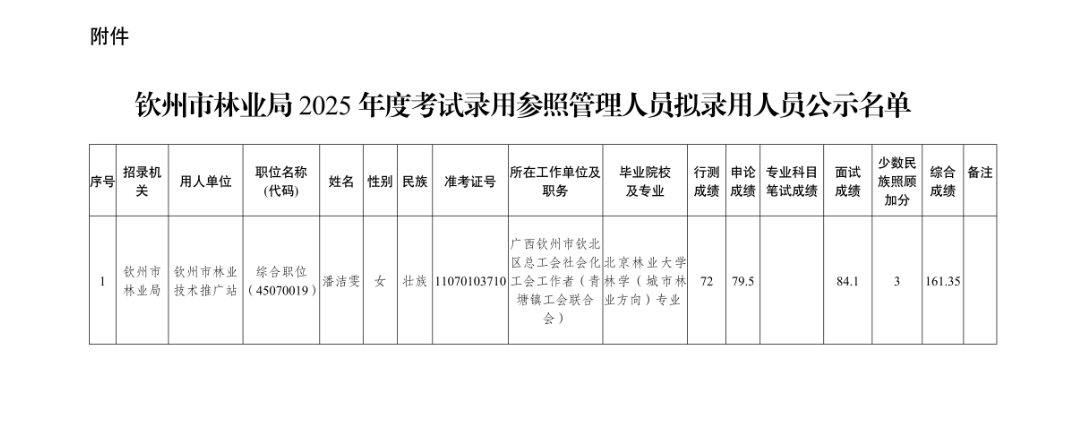 根據(jù)《廣西壯族自治區(qū)2025年度考試錄用公務(wù)員公告》等有關(guān)規(guī)定,我單位2025年計(jì)劃招錄1名參照管理人員,經(jīng)過公開報(bào)名、資格審查、筆試、面試、體檢、考察等程序,擬錄用潘潔雯同志(附件)為參照管理人員,現(xiàn)予以公示。公示期5個(gè)工作日,如對擬錄用人員的錄用資格有異議,請?jiān)诠酒趦?nèi)向欽州市林業(yè)局辦公室實(shí)名反映。