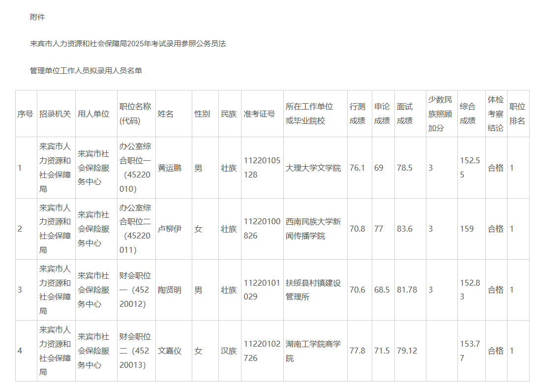 2025來賓人力資源和社會(huì)保障局公務(wù)員考試錄用工作人員擬錄用人員公示