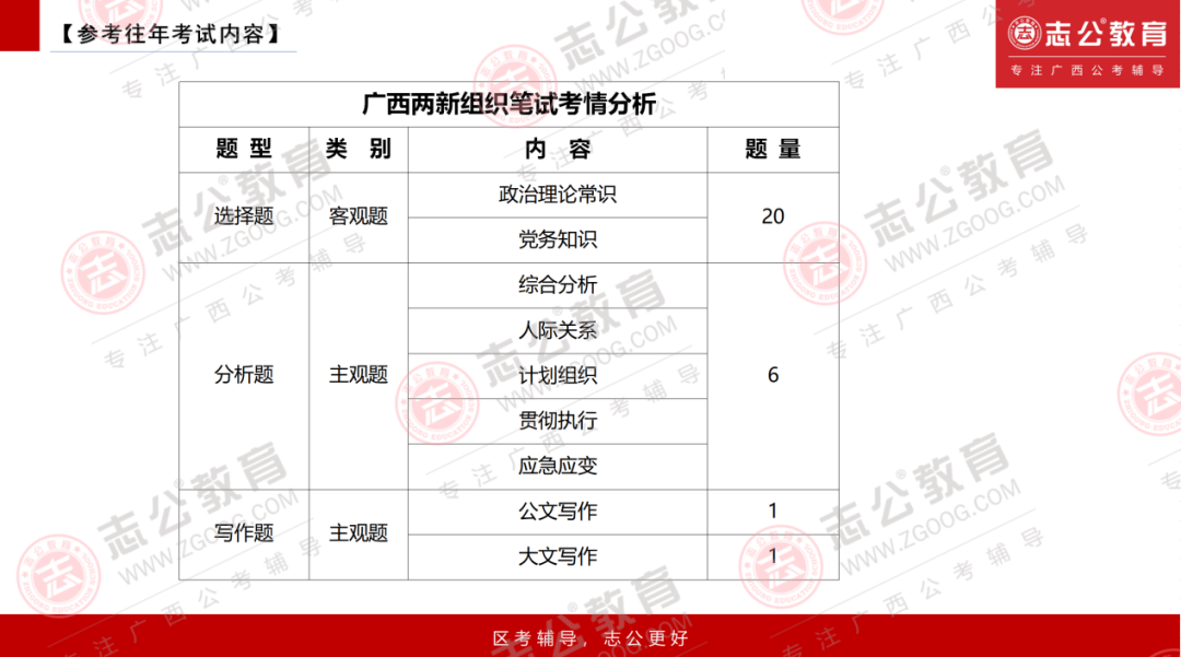 綜合能力素質(zhì)測(cè)試,分值為100分。但是我們志公教育教研團(tuán)隊(duì)仍能大致大家劃分備考范圍,大家參考一下: