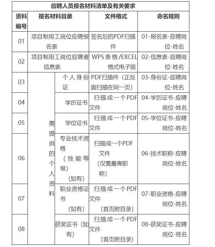 應聘人員按照《應聘人員報名材料清單及有關(guān)要求》提供相應報名材料,壓縮成一個文件(文件名和郵件主題統(tǒng)一以本人姓名進行命名),發(fā)送至電子郵箱:515827308@qq.com。本次招聘僅接受電子郵件方式報名,報名材料一經(jīng)提交不能修改。