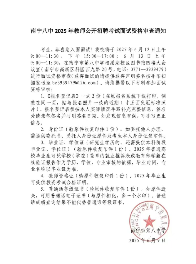 南寧八中2025年教師公開招聘考試面試資格審查通知