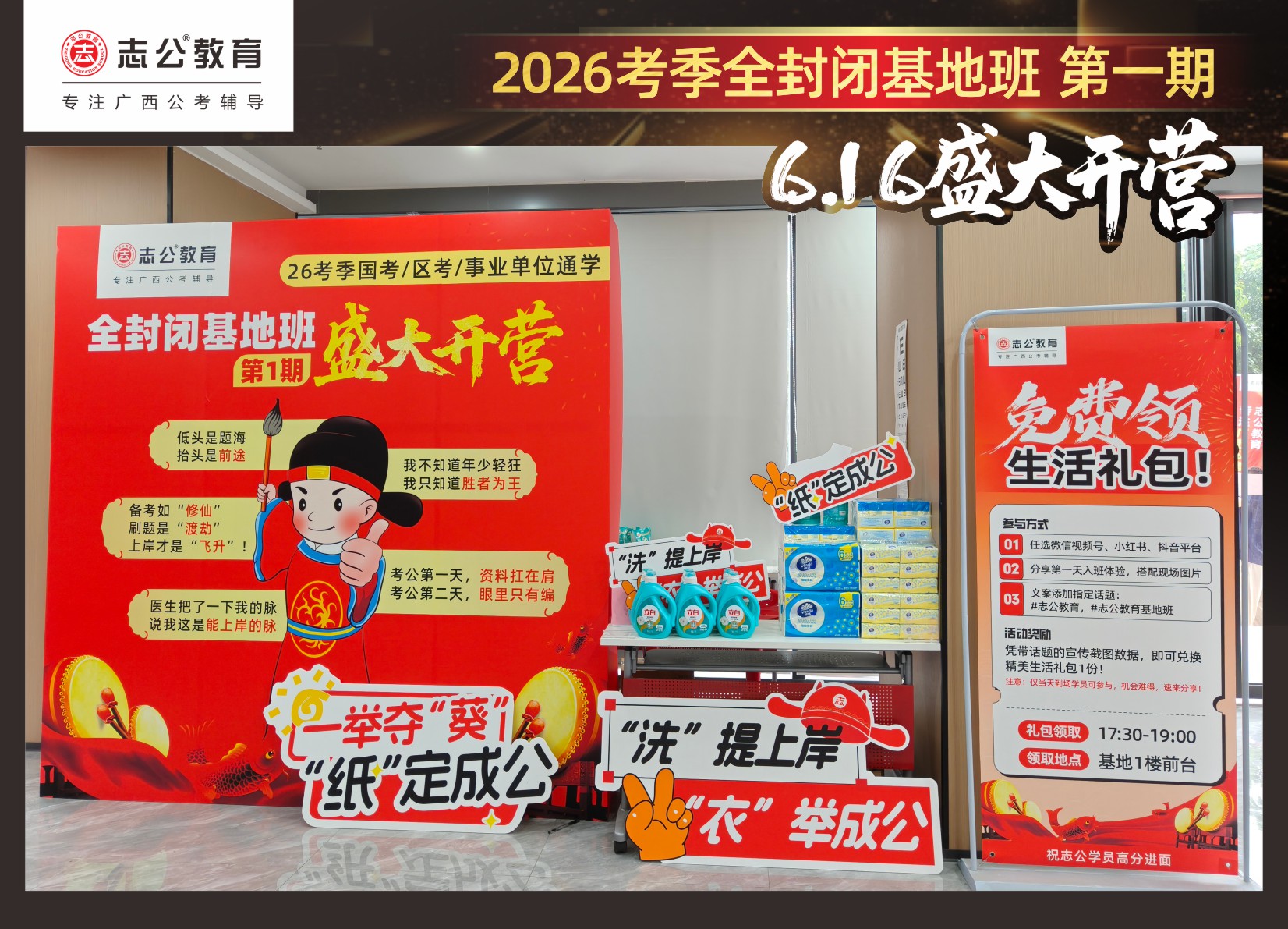 今天的開班還有一系列小活動噢~瞧!——“學(xué)員打卡活動”,所有今天到場的基地班學(xué)員,通過做一些小任務(wù)的方式,可以到前臺領(lǐng)取生活禮包即可領(lǐng)取生活禮品1份(一提六包的紙巾,或者一瓶洗衣液),這也是志公教育對所有學(xué)員的美好祝愿,預(yù)祝大家未來能夠“紙”定成公,“洗”提上/岸,“衣舉成公”!