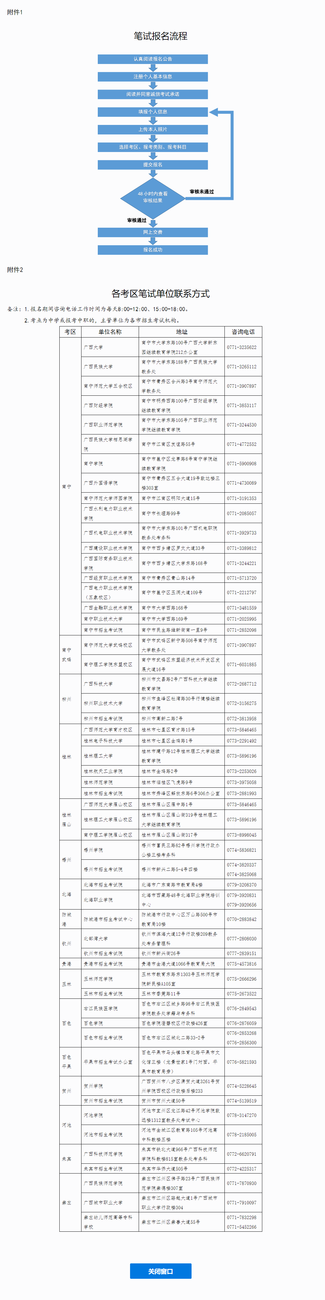 (一)有關(guān)此次考試的信息將在“中小學(xué)教師資格考試”網(wǎng)站、“廣西招生考試院”網(wǎng)站、“柳園清風”微信公眾號、“廣西中小學(xué)教師資格考試考生自助平臺”上發(fā)布,請考生密切關(guān)注。其他未盡事宜,可聯(lián)系各筆試單位咨詢。