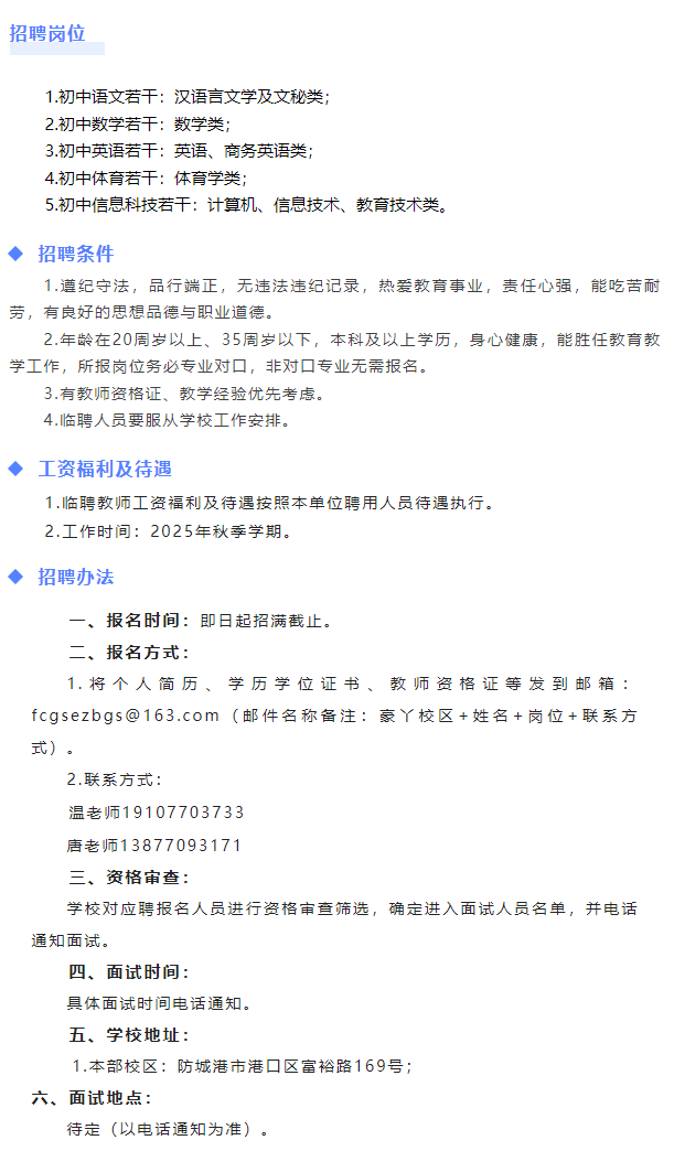 原文標(biāo)題:防城港市第二中學(xué)(豪丫校區(qū))2025年秋季學(xué)期臨聘教師招聘公告
