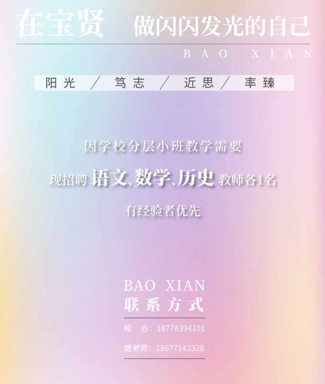 4.取得初級中學(xué)以上教師資格證,具有良好的身體和心理素質(zhì),體檢符合教師資格認(rèn)定標(biāo)準(zhǔn),對教育有理想追求,理解并愿意踐行桂林市疊彩區(qū)寶賢學(xué)校辦學(xué)理念。