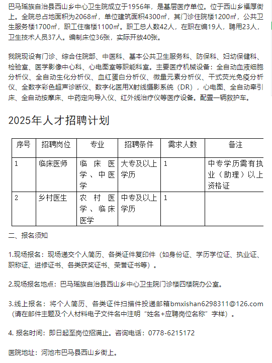 2025年巴馬瑤族自治縣西山鄉(xiāng)中心衛(wèi)生院人才招聘