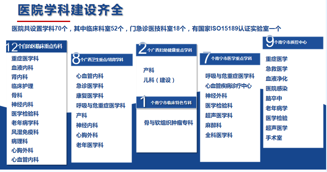 南寧市第一人民醫(yī)院(南寧市兒童先天性心血管疾病研究所、南寧市呼吸道疾病研究所、廣西醫(yī)科大學(xué)第五臨床醫(yī)學(xué)院、廣西醫(yī)科大學(xué)第五附屬醫(yī)院)始建于1914年,是一家擁有百年歷史的國家三級甲等綜合性醫(yī)院。醫(yī)院設(shè)有52個臨床病區(qū),18個門診醫(yī)技科室,總開放床位1912張(含分院)。醫(yī)院是國家高級認(rèn)知中心建設(shè)單位及國家神經(jīng)介入建設(shè)中心、國家ISO15189醫(yī)學(xué)檢驗(yàn)認(rèn)證機(jī)構(gòu),國家聯(lián)盟中心認(rèn)證的胸痛中心、卒中中心;擁有廣西臨床重點(diǎn)??疲ê嘤?2個、自治區(qū)醫(yī)療衛(wèi)生重點(diǎn)學(xué)科(含培育)8個、自治區(qū)婦幼健康服務(wù)重點(diǎn)學(xué)科(含建設(shè))2個、南寧市醫(yī)學(xué)重點(diǎn)學(xué)科7個、南寧市臨床特色優(yōu)勢???個,南寧市質(zhì)控中心9個。醫(yī)院是國家衛(wèi)健委創(chuàng)面修復(fù)能力建設(shè)和繼續(xù)教育中心教學(xué)基地、國家級住院醫(yī)師規(guī)范化培訓(xùn)培訓(xùn)基地,廣西醫(yī)科大學(xué)碩士研究生培養(yǎng)基地,同時是暨南大學(xué)共建醫(yī)學(xué)教育基地、第十批廣西博士后創(chuàng)新實(shí)踐基地;醫(yī)院還具備國家藥物臨床試驗(yàn)機(jī)構(gòu)資質(zhì)(含I期研究室);醫(yī)院醫(yī)學(xué)實(shí)驗(yàn)中心獲批廣西科技廳重點(diǎn)實(shí)驗(yàn)室“廣西智慧精準(zhǔn)醫(yī)學(xué)實(shí)驗(yàn)室”,是南寧市衛(wèi)健系統(tǒng)唯一的省級重點(diǎn)建設(shè)實(shí)驗(yàn)室。2019年在市委市政府支持下,成立南寧市第一人民醫(yī)院醫(yī)療集團(tuán)?,F(xiàn)有27家成員單位,形成“1+4+22”(中心醫(yī)院+4家二級醫(yī)院+22家基層衛(wèi)生及養(yǎng)老機(jī)構(gòu))一體化格局,推行“三二一”運(yùn)營管理模式,逐步構(gòu)建全生命周期健康管理鏈。