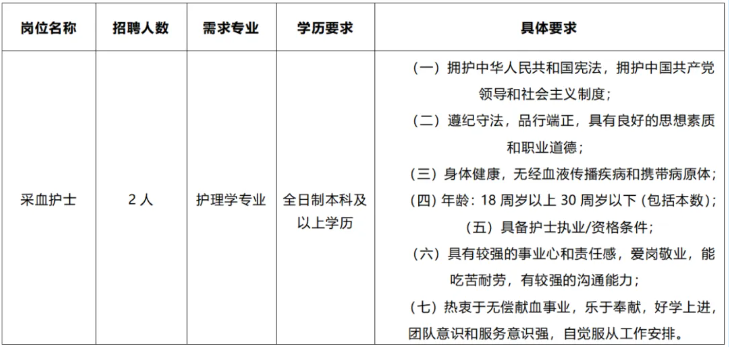 報名所需材料:《河池市中心血站公開招聘報名表》(附件)、個人簡歷、畢業(yè)證書、學(xué)位證書、護(hù)士執(zhí)業(yè)證/資格證、身份證等,若個人具備特長,需一并附上相關(guān)佐證材料。請攜帶以上材料原件及復(fù)印件至指定報名地點。應(yīng)聘人員應(yīng)對報名材料的真實性負(fù)責(zé),凡弄虛作假的,一經(jīng)查實,即取消報名和聘用資格。