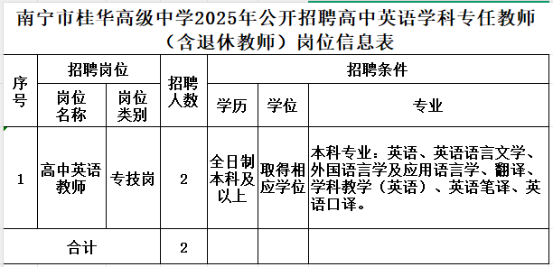 3.網(wǎng)上報(bào)名。應(yīng)聘者需規(guī)范填寫《南寧市桂華高級(jí)中學(xué)公開(kāi)招聘專任教師報(bào)名表》(見(jiàn)附件2),將個(gè)人應(yīng)聘證明材料一并打包(學(xué)科+姓名+聯(lián)系電話)發(fā)送到nnsghgjzx2022@163.com郵箱。