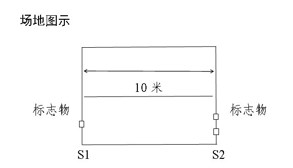 動作要求:受測試者采用站立式起跑,聽到發(fā)令后從S1線外跑到S2線前(腳不得踩線)用手將豎立的木塊推倒后折返,往返跑2次,每次推倒1個木塊,第2次返回時沖出S1線。