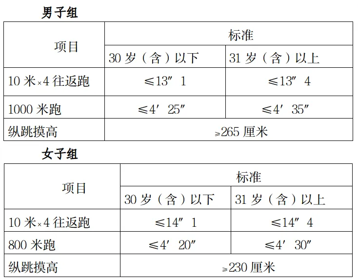 測(cè)評(píng)結(jié)果分為合格和不合格。一般體能測(cè)評(píng)三項(xiàng)成績均達(dá)標(biāo)的方為合格,其中具有研究生及以上學(xué)歷報(bào)考人員,體能測(cè)評(píng)三個(gè)項(xiàng)目中有任何兩項(xiàng)達(dá)標(biāo)的,即視為合格。體能測(cè)試時(shí)間、地點(diǎn):另行通知。