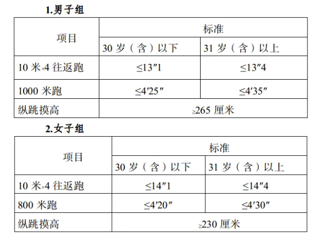 參照《關(guān)于印發(fā)<公安機(jī)關(guān)錄用人民警察體能測評項(xiàng)目和標(biāo)準(zhǔn)>的通知》(公政治〔2024〕60號)執(zhí)行,每個測評項(xiàng)目分別記錄成績。其中縱跳摸高的測評次數(shù)不超過3次,10米×4往返跑測評次數(shù)不超過2次,男子1000米跑、女子800米跑測評次數(shù)均為1次。