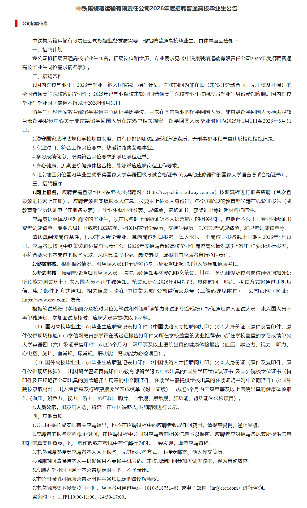 中鐵集裝箱運(yùn)輸有限責(zé)任公司2026年度招聘普通高校畢業(yè)生公告