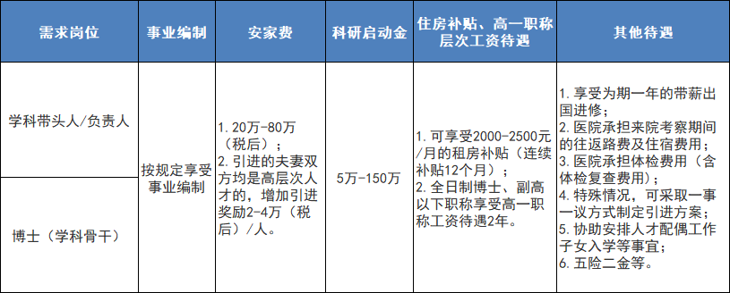待遇參照國家事業(yè)單位標(biāo)準(zhǔn)或按照醫(yī)院相關(guān)規(guī)定執(zhí)行,根據(jù)不同人員類別給予5萬元至10萬元(稅后)安家補(bǔ)助獎勵,具體內(nèi)容請仔細(xì)閱讀招聘公告。